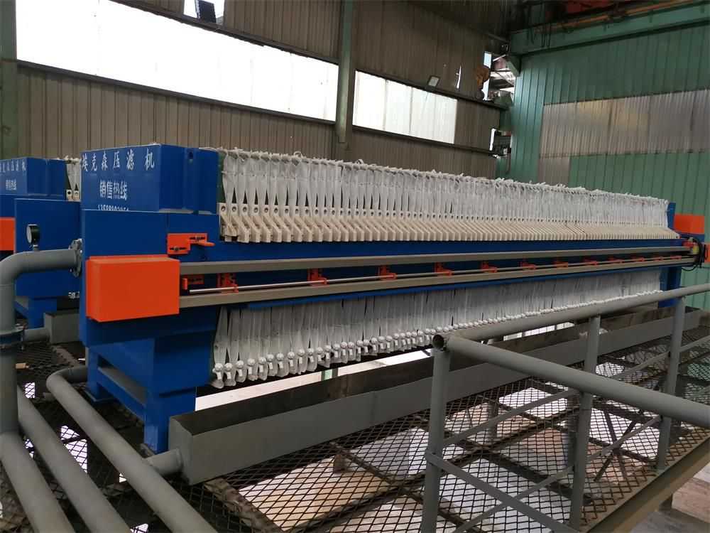 隔膜壓榨壓濾機是由隔膜板和廂式濾板排列組成濾室,在輸料泵的壓力作用下將料漿輸入濾室,通過過濾介質(濾布)將料漿中的固體和液體分離,當料漿中的固體形成餅后,再向隔膜通入空氣,對濾室內的固體充分壓榨。